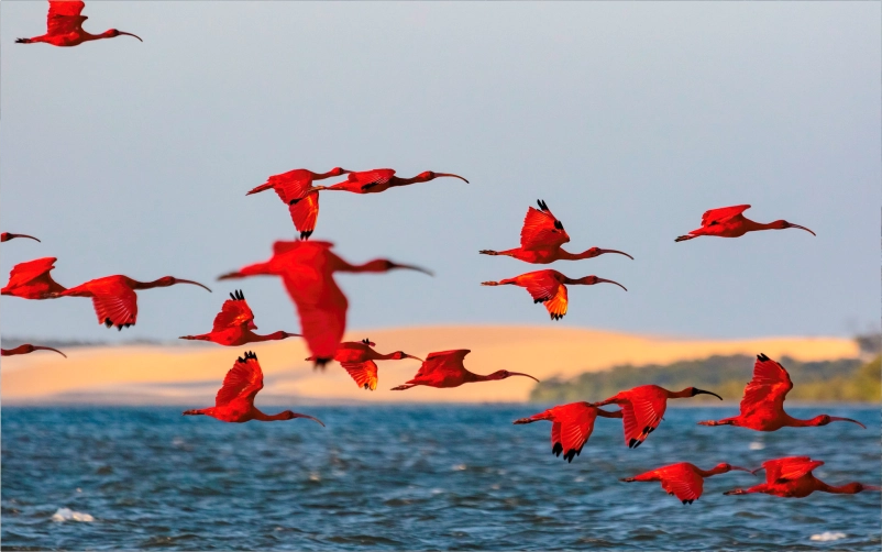 Embarque em uma experiência única e inesquecível para contemplar a deslumbrante revoada dos guarás, aves de plumagem vermelha intensa que tingem o céu ao entardecer em um espetáculo natural incomparável.
